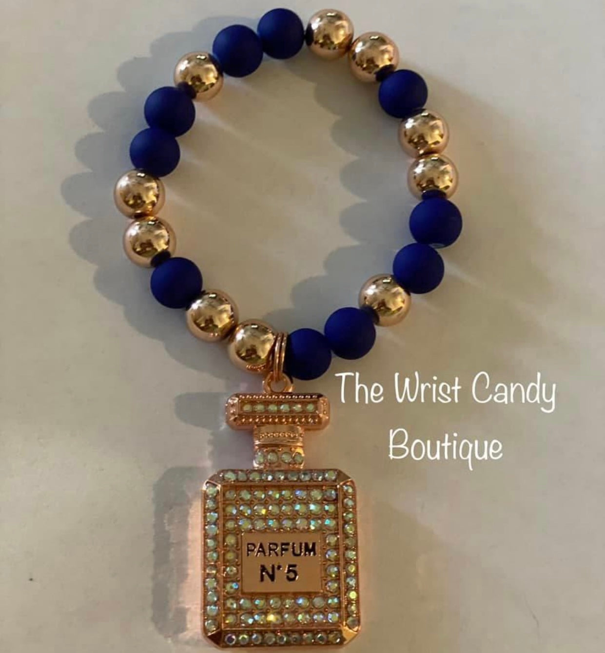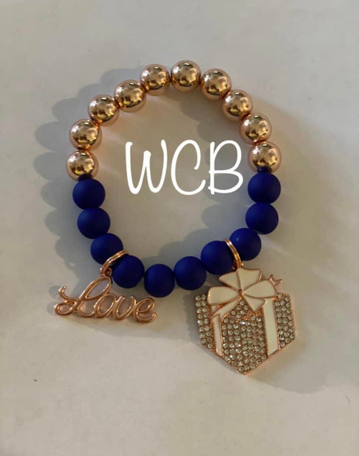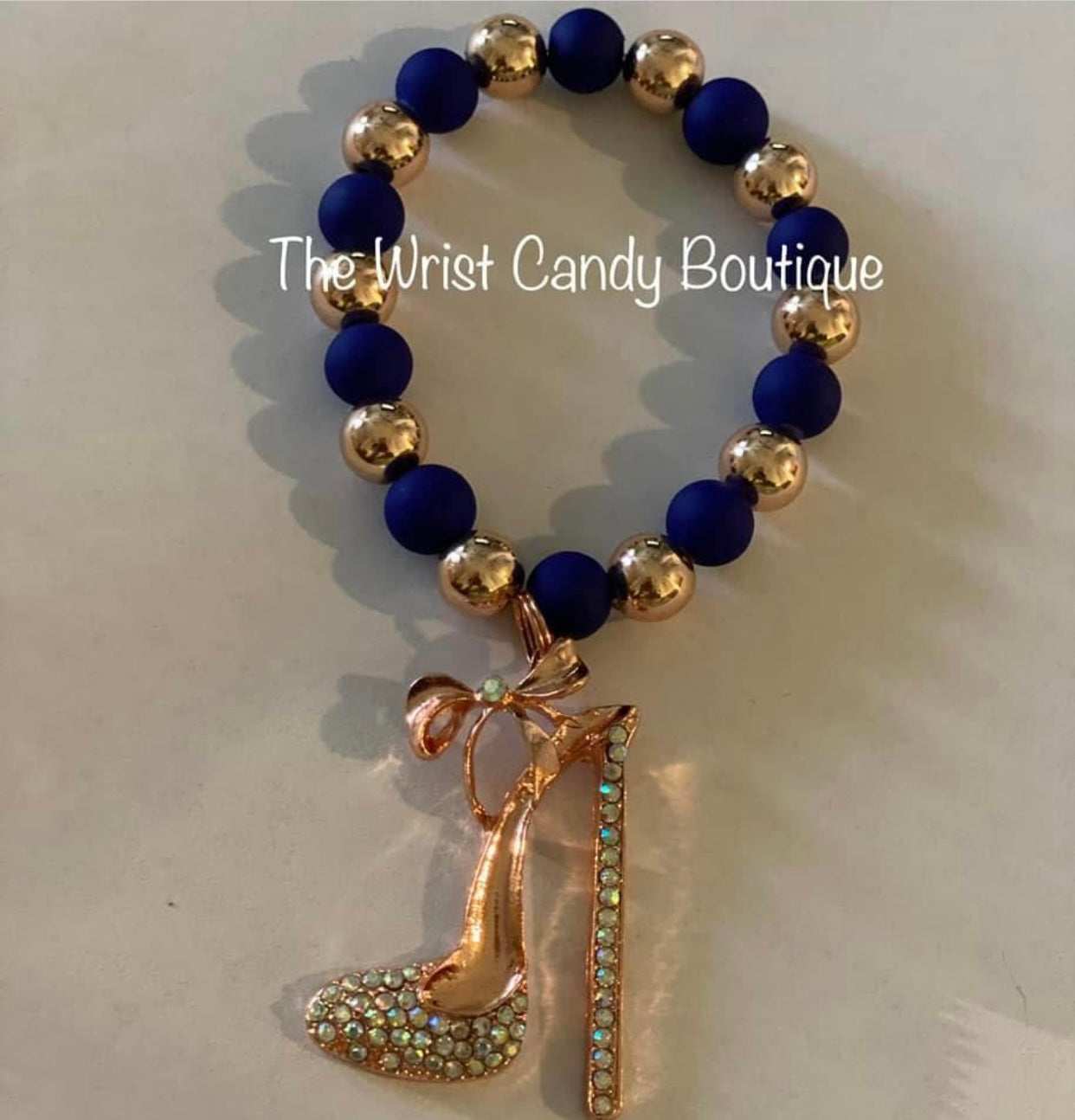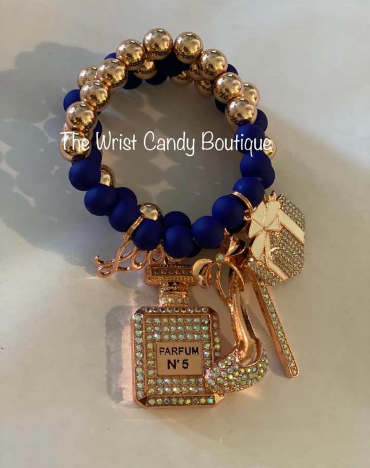Matte blue and Rose Gold Hematite beads with 3 Rose Gold charms.