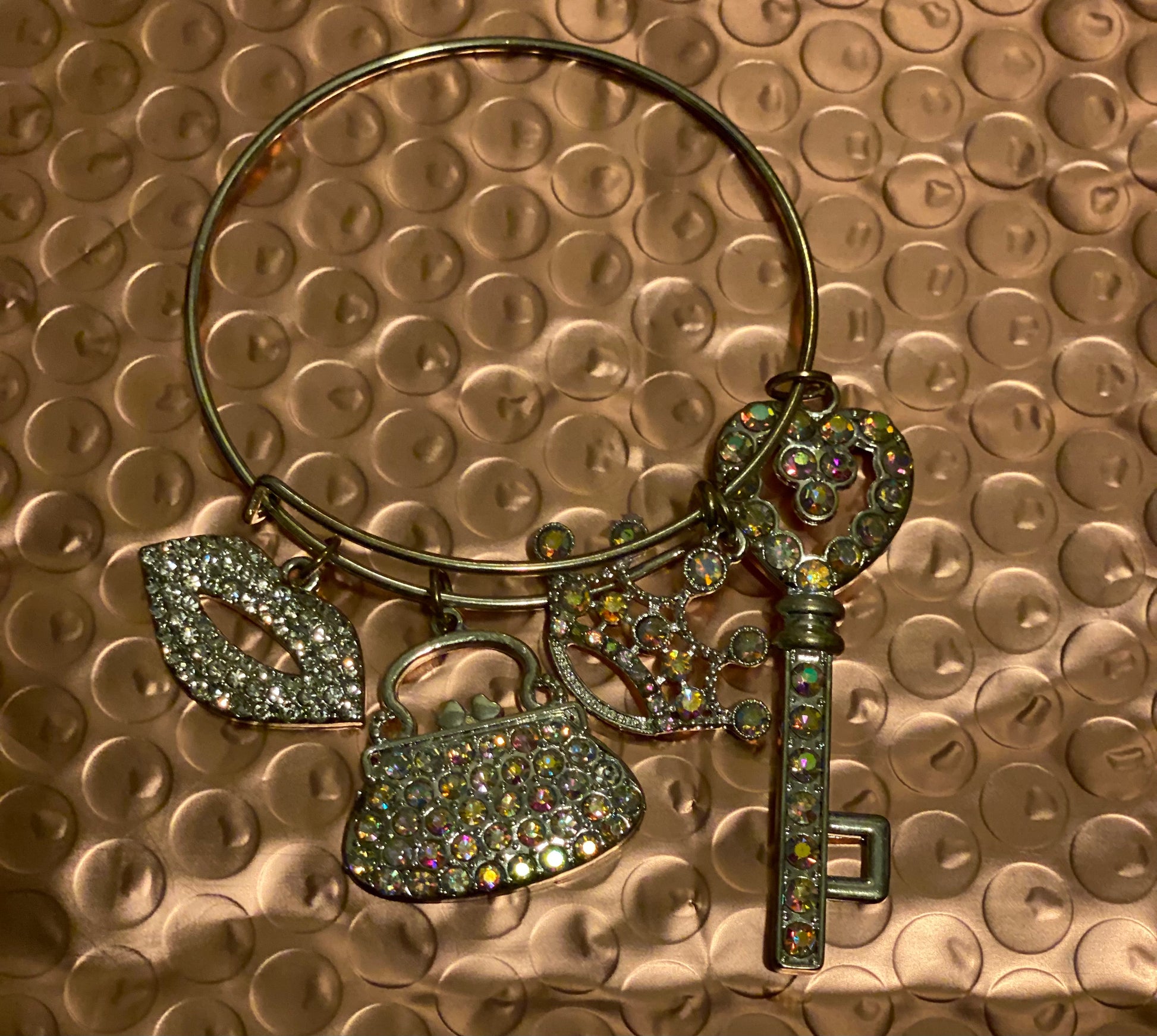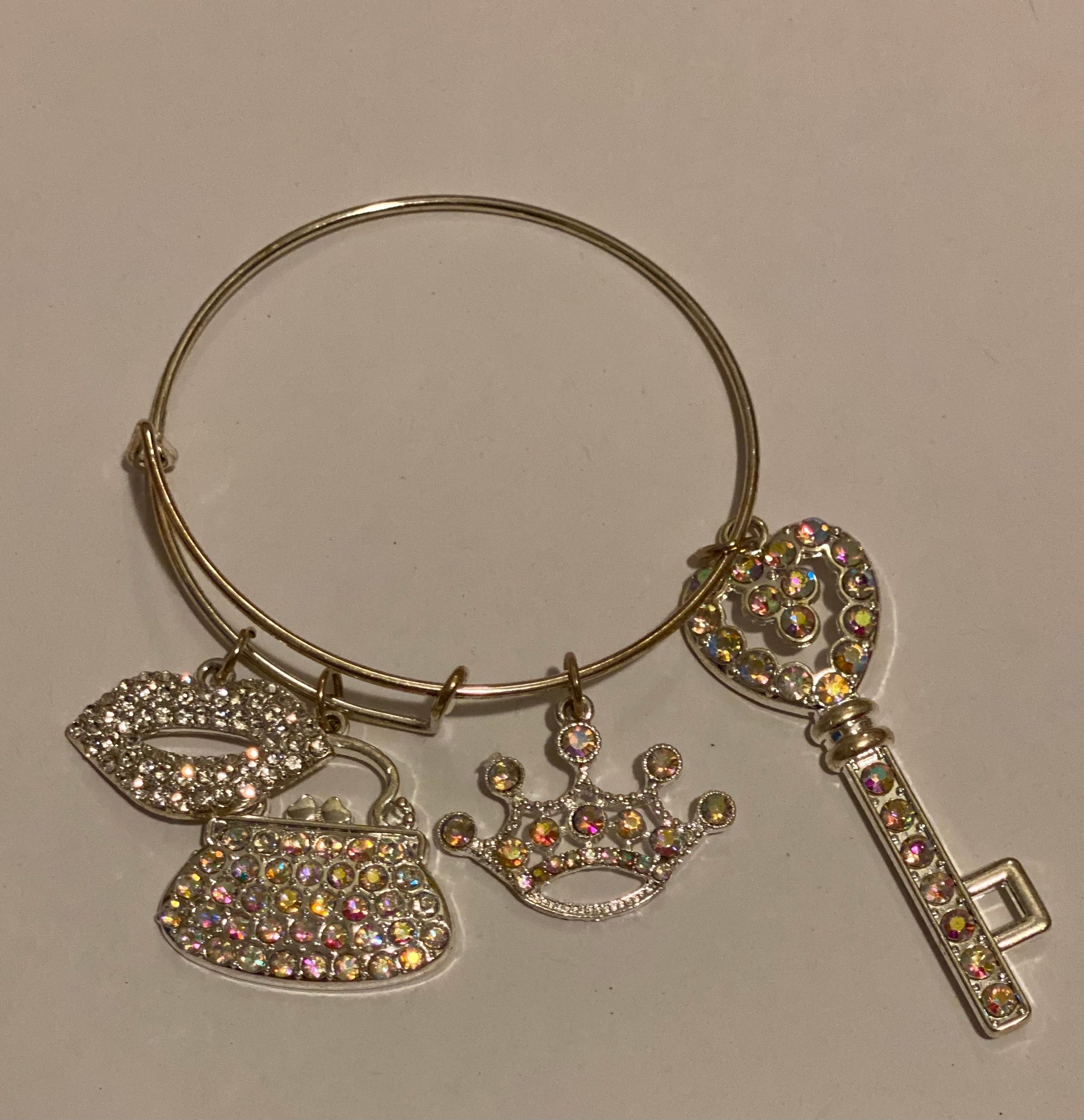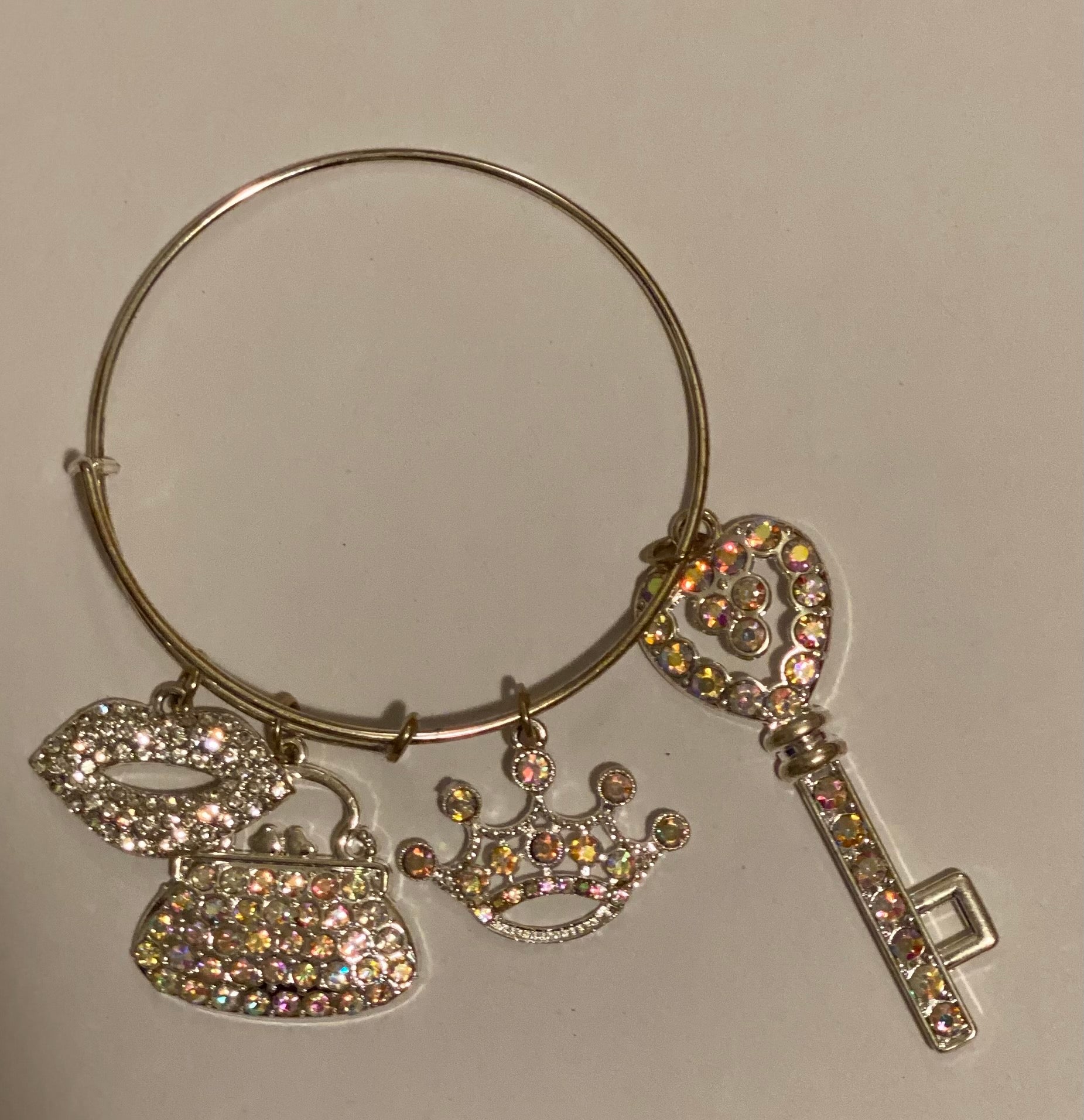 Three gold rhinestone charms with a gold bangle. Great to wear alone or a set!!