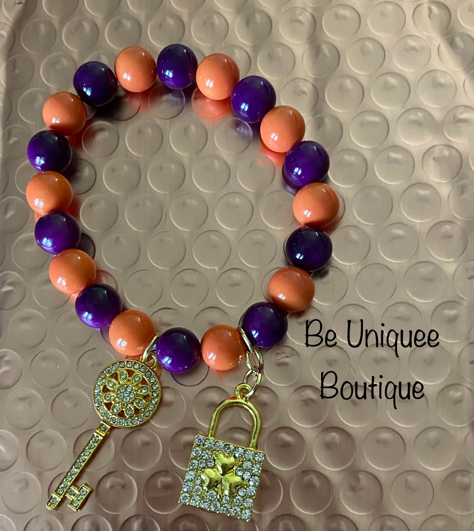 Tangerine and purple glass beads with a lock and key charm set make up this unique bracelet!!
